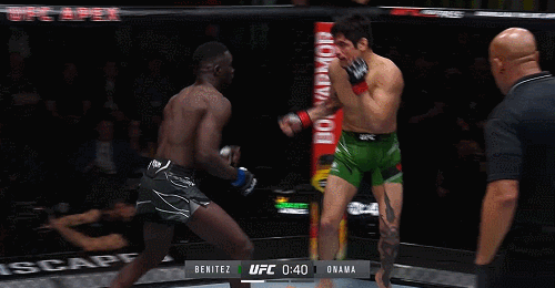 With less than a minute left in the first round, Onama backed Benitez up against the cage where he unloaded a vicious onslaught of strikes. It was roughly a 10-15 piece combo with two sides and an extra large drink.